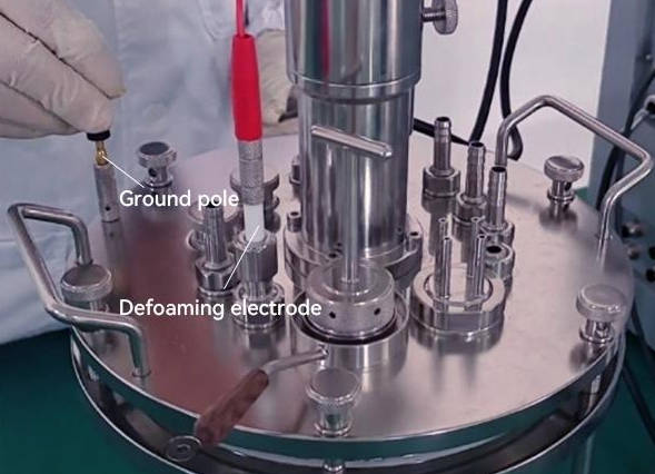 The fermenter lid will usually have a set of defoaming electrodes and a grounding post forming a line.The fermenter lid will usually have a set of defoaming electrodes and a ground pole forming a line.When the foam rises to the antifoaming electrode position, an electrical signal will be formed between the antifoaming electrodes to issue an early warning switch signal system, representing the rising foam in the tank and the need to put antifoaming agent.