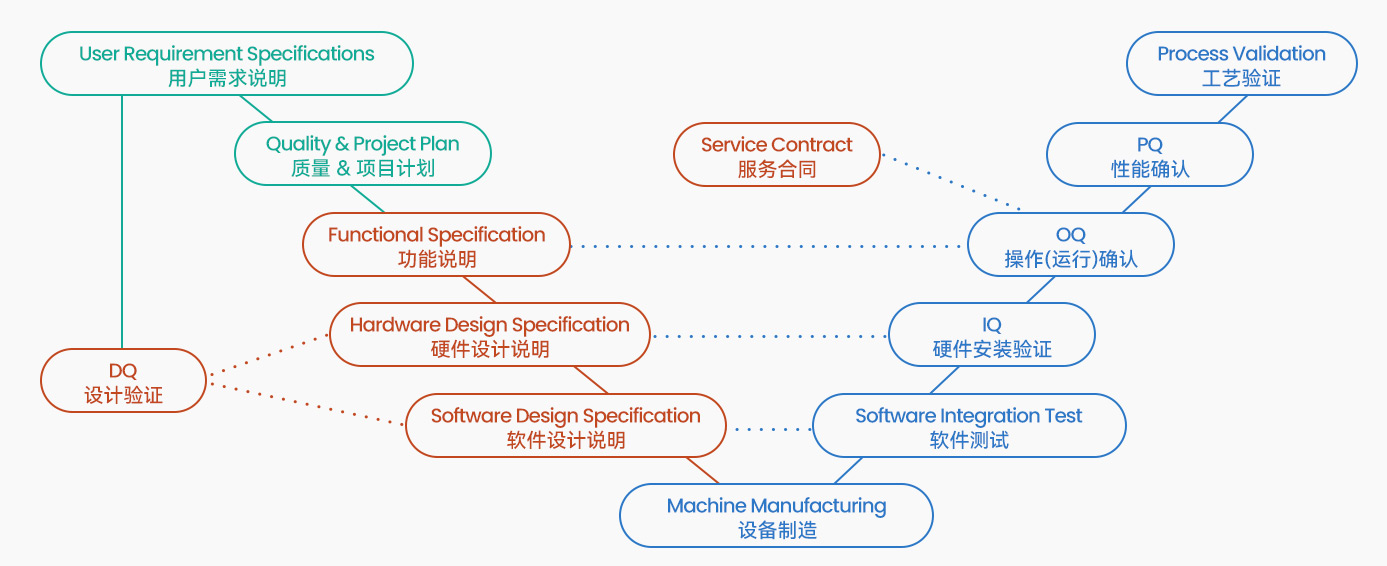 本服务认证包含: 通常地,确认应该从用户需求规范(URS)的准备开始。然后根据设备或者系统的功能和操作特点,选择不同的确认阶段,如设计确认(DQ)、工厂验收测试(FAT)、安装确认(IQ)、运行确认(OQ)和性能确认(PQ)。确认时,一个阶段在开始下一个阶段前需被成功地完成。 |
