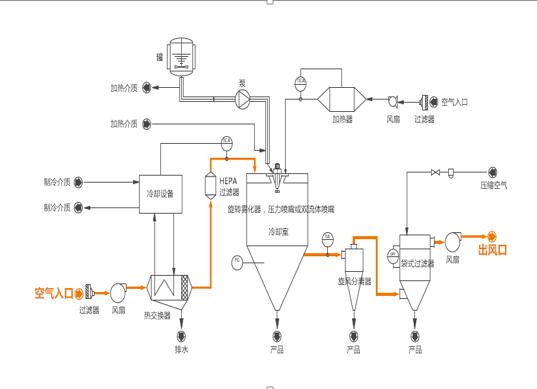 喷雾冷冻干燥机系统由喷雾塔、喷嘴、加热装置、储液槽、过滤系统、阀门、空气过滤、鼓风机、冷冻压缩机、加热系统、旁路管、为喷嘴所提供的喷雾气体等组成