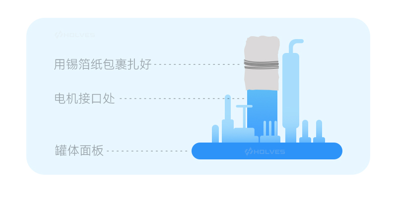 取下生物反应器的搅拌电机,平放于桌上,电机接口处用锡箔纸包好并用皮筋捆扎,防止灭菌过程脱落,以消除高压蒸汽灭菌时产生的高温蒸汽对电机接口的破坏。