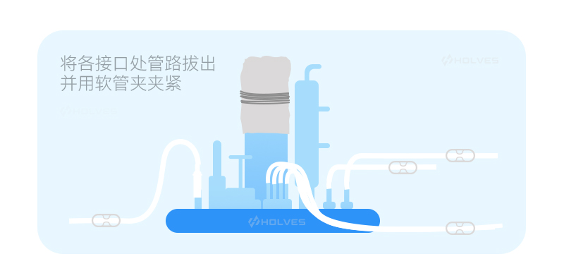 收获管、备用管口分别使用软管夹夹紧面板端。