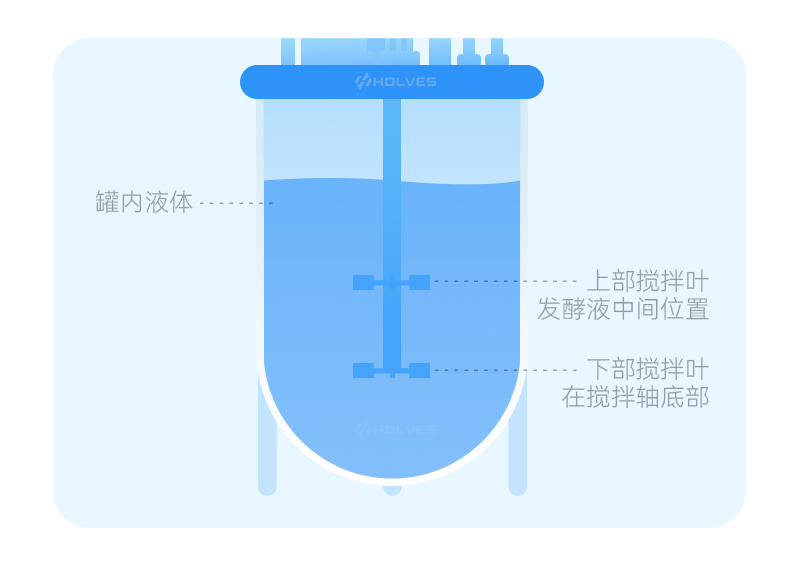 灭菌前需调整好搅拌叶的位置,下部搅拌叶尽量安装在搅拌轴底部,上部搅拌叶调整到所加发酵液的中间位置。
